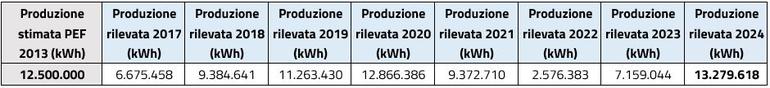 Dopo la forte siccità registrata nel 2022, che aveva fatto seguito ad un 2021 già molto avaro di precipitazioni, il 2023 ha visto un miglioramento sotto il profilo idrico con la produzione della centrale che ha segnato un aumento del 178% di rispetto all’anno precedente raggiungendo i 7 milioni di kWh. Il 2024 ha confermato il trend positivo iniziato nel 2023, con abbondanti nevicate e precipitazioni che hanno permesso di raggiungere la produzione record di 13,2 milioni di kWh, finanche sopra le stime iniziali e circa il doppio dell’anno precedente. L’importante piovosità dei mesi estivi e autunnali ha portato al miglior luglio e ottobre dall’inaugurazione della centralina.